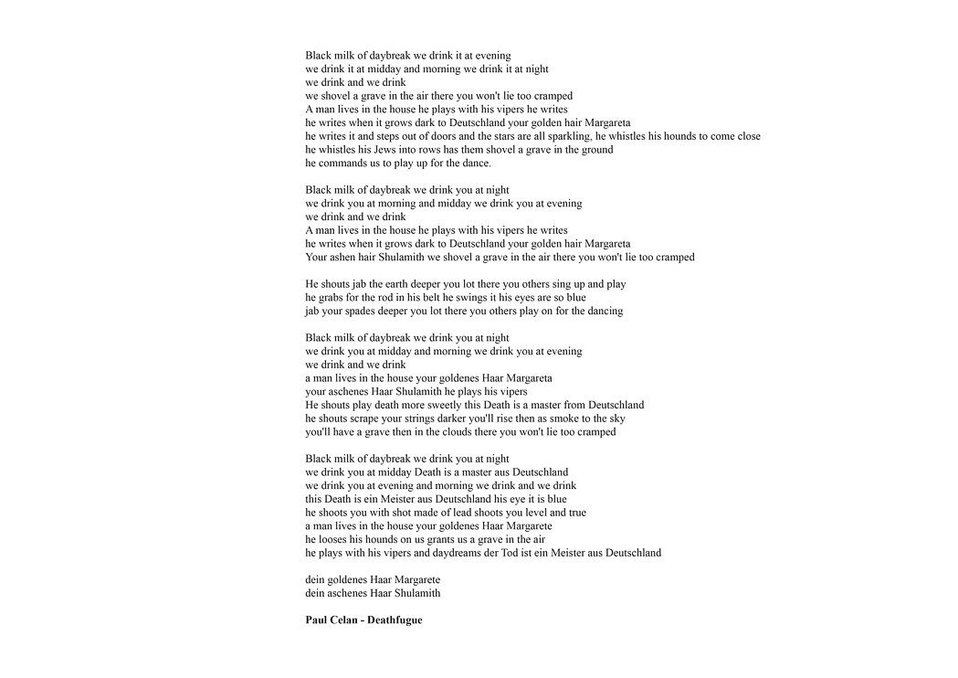 Black milk of daybreak we drink it at evening we drink it at midday and morning we drink it at night we drink and we drink we shovel a grave in the air there you won't lie too cramped A man lives in the house he plays with his vipers he writes he writes when it grows dark to Deutschland your golden hair Margareta he writes it and steps out of doors and the stars are all sparkling, he whistles his hounds to come close he whistles his Jews into rows has them shovel a grave in the ground he commands us to play up for the dance. Black milk of daybreak we drink you at night we drink you at morning and midday we drink you at evening we drink and we drink A man lives in the house he plays with his vipers he writes he writes when it grows dark to Deutschland your golden hair Margareta Your ashen hair Shulamith we shovel a grave in the air there you won't lie too cramped